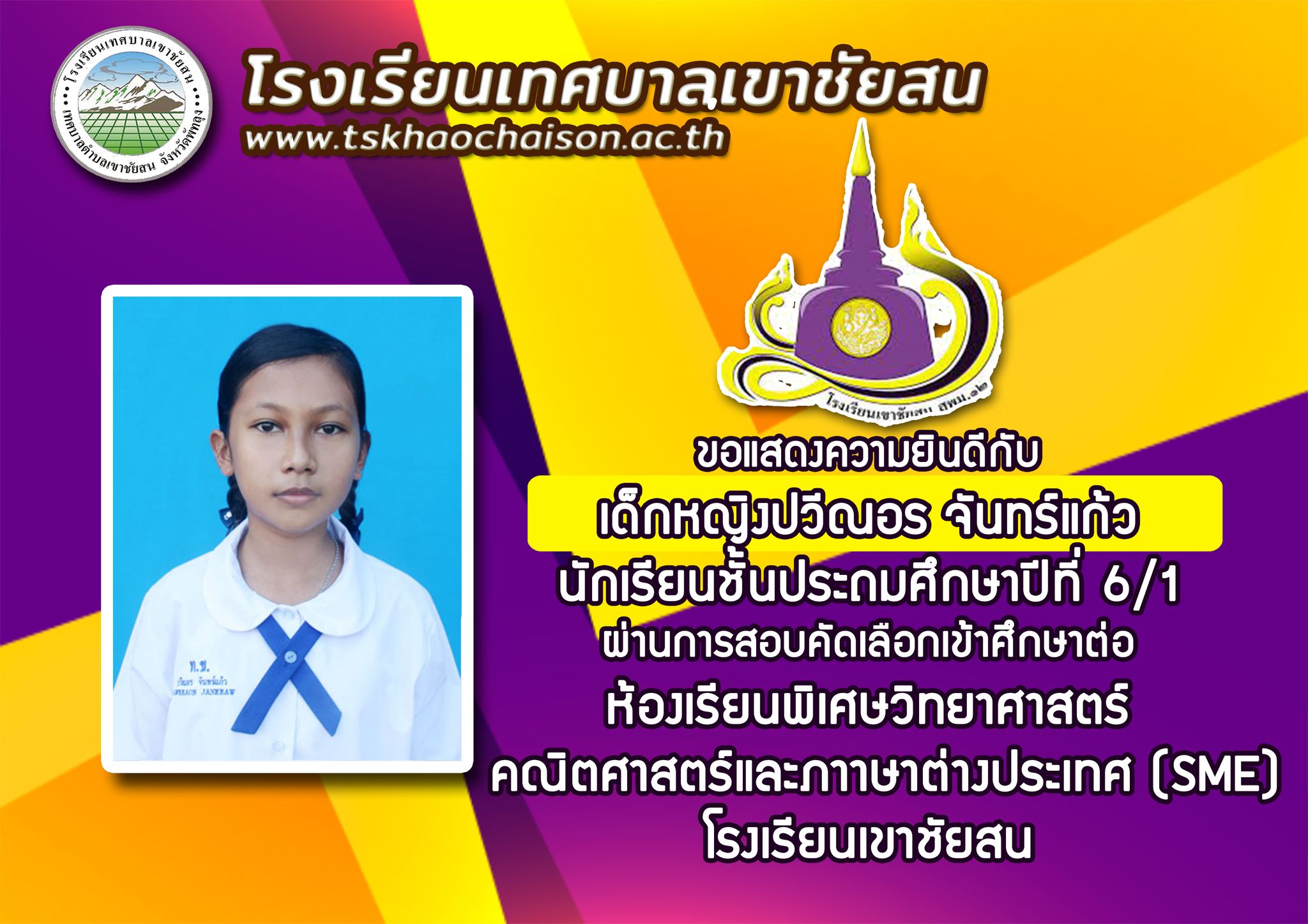 ขอเเสดงความยินดีกับ เด็กหญิงปวีณอร จันทร์แก้ว