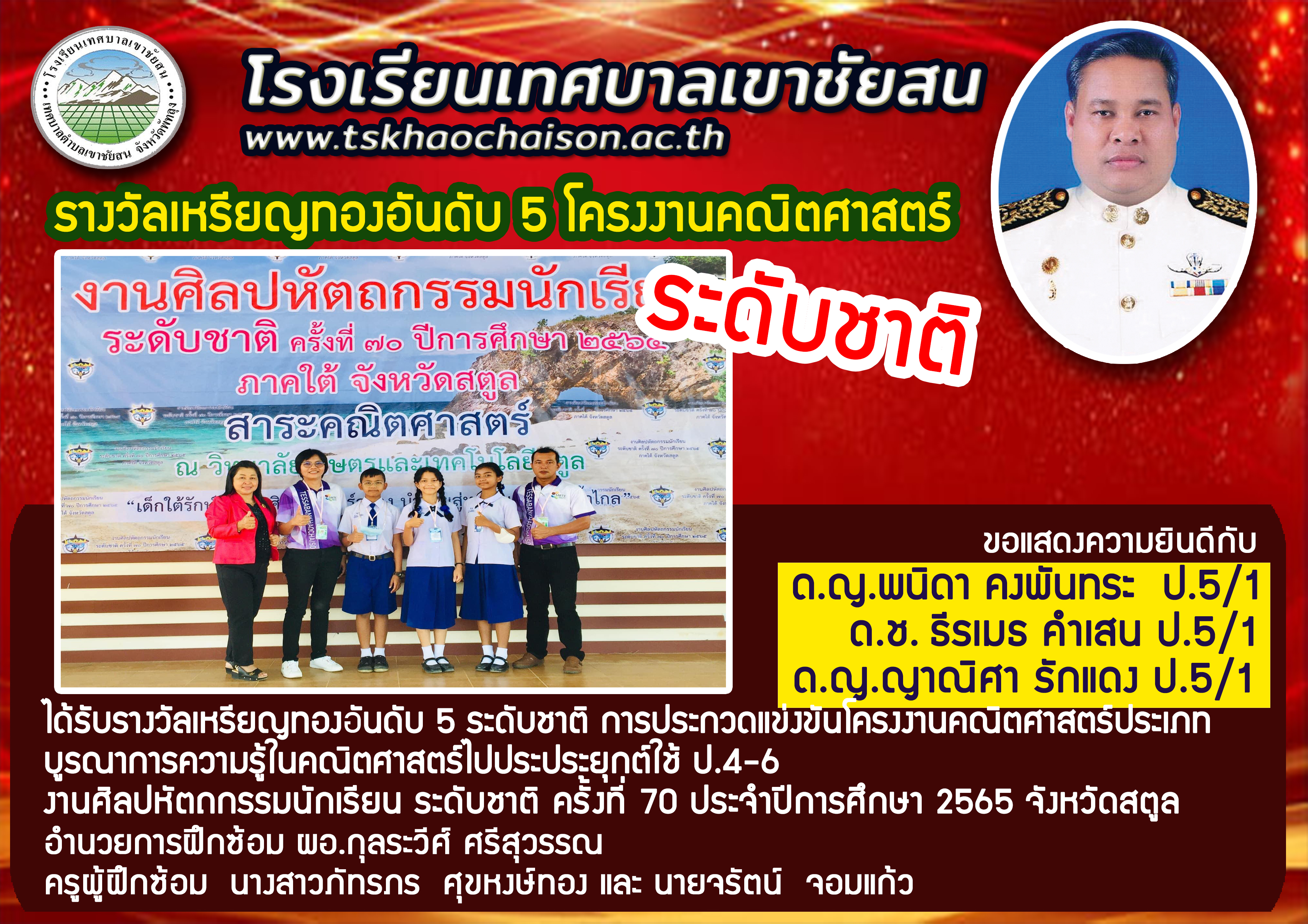 รางวัลเหรียญทองอันดับ5 โครงงานคณิตศาสตร์ เด็กหญิงพนิดา คงพันทระ ป.5/1 เด็กชายธีรเมธ คำเสน ป.5/1 เด็กหญิงญาณิศา รักแดง ป.5/1
