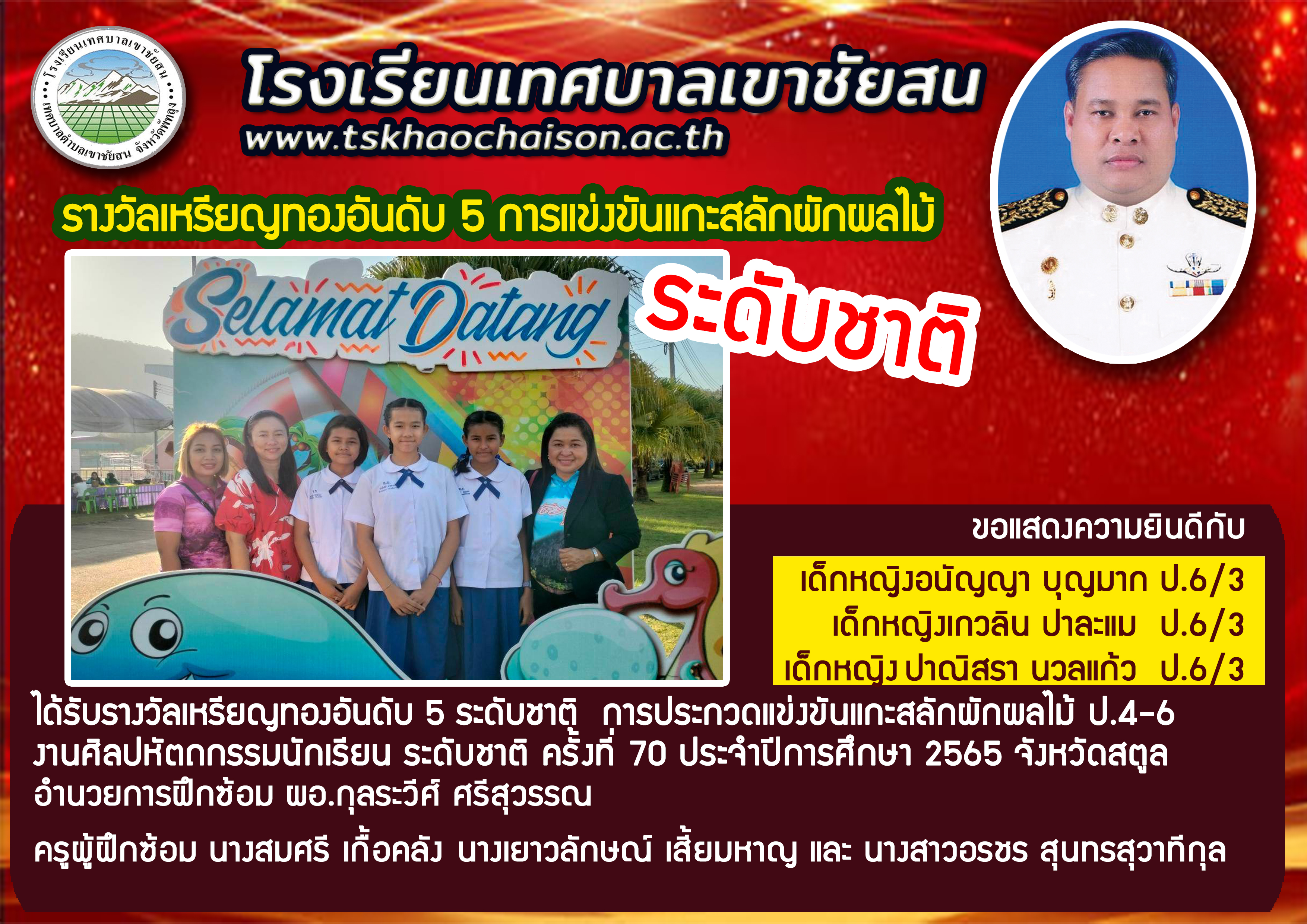 รางวัลเหรียญทองอันดับ5 การแข่งขันแกะสลักผลไม้ เด็กหญิงอนัญญา บุญมาก ป.6/3 เด็กหญิงเกวลิน ปาละแม ป.6/3 เด็กหญิงปณิสรา นวลแก้ว ป.6/3
